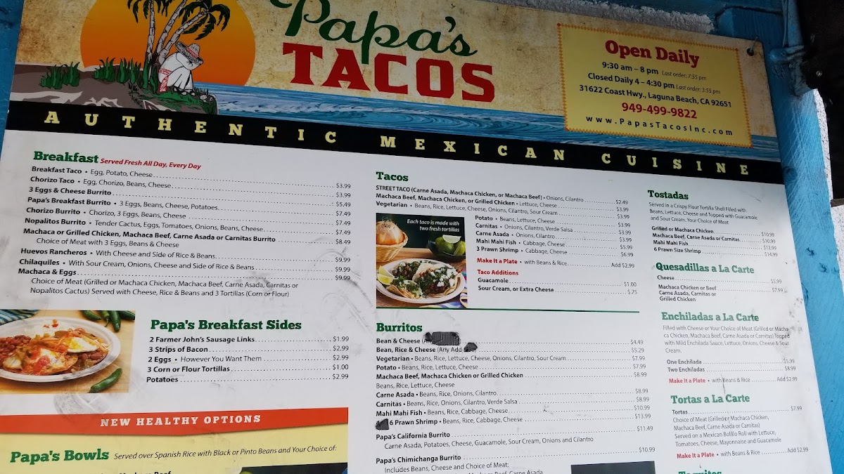 Welcome to Papa's Tacos, a vibrant gem nestled in Laguna Beach, California, where authentic Mexican flavors come alive. Located at 31622 Coast Hwy, this eatery offers a delightful menu that caters to everyone—from taco enthusiasts to health-conscious diners.